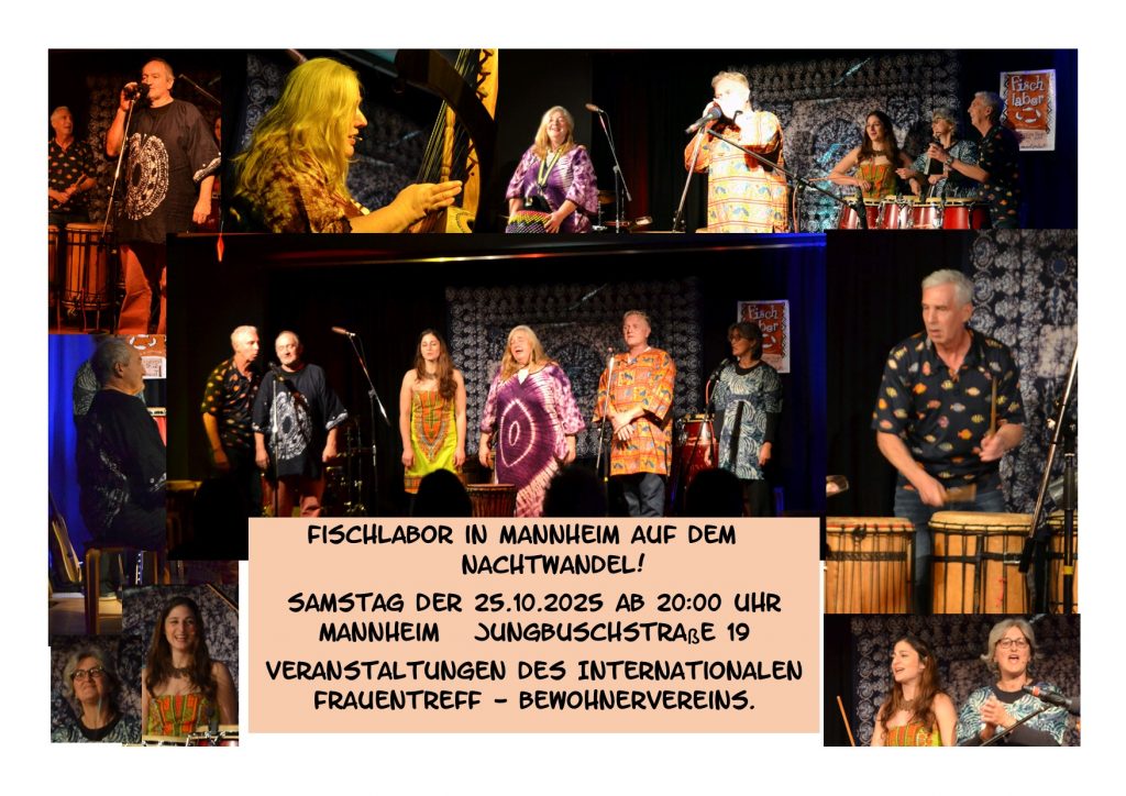 Fischlabor existiert seit 1992 in immer wechselnder Besetzung. Einzig der Gründer Rolf (Chips) Lautenbach und Manfred Woody) Kleinecke sind der Band treu geblieben. Mit den einzelnen Bandmitgliedern wurden immer wieder neue Einflüsse in die Band eingebracht. Einiges hat die Zeit geschluckt, anderes wurde fester Bestandteil des Repertoires. So entstand eine der wohl vielseitigsten Percussion – Bands im Rhein – Neckar – Raum. Zur Zeit besteht die Gruppe aus sechs Musikern (Siehe auch „über uns“). Unsere Stücke sind in etwa zu einem Drittel von Lateinamerikanischen und zu einem weiteren Drittel von Afrikanischen Rhythmen geprägt. Die Restlichen Stücke sind Eigenkompositionen. Unsere reichliche Live – Erfahrung hat uns zu der Überzeugung gebracht, dass wir unser Publikum immer aktiv mit einbinden sollten. Dies vermittelt in direkter Form die Urkraft der ältesten Musikinstrumente, nämlich Trommel und Gesang.